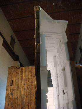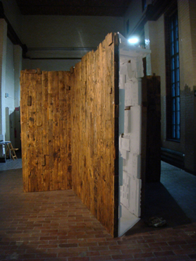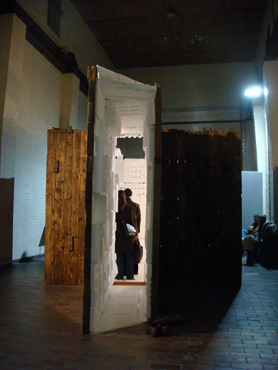 DIE HÜTTE #4 auf dem 5. Berliner Kunstsalon zeigt in einem aus verwitterten Holzbrettern verschraubten Gehäuse einen Mann