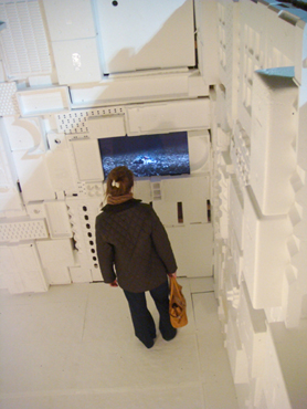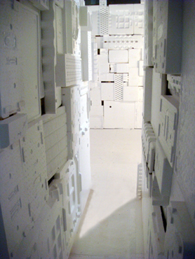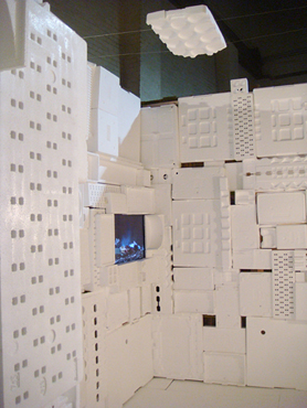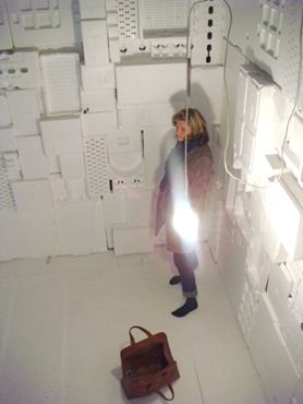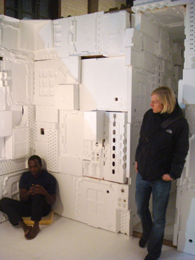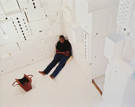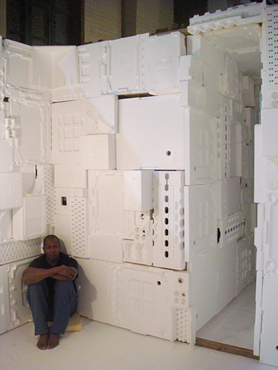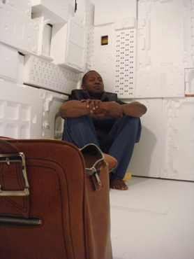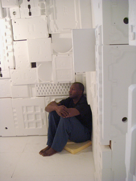 aus Westafrika. Als stille Menschenskulptur sitzt er in dem aus weißem Verpackungsstyropor ausgekleideten Innenraum.